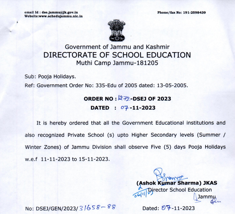 “It is hereby ordered that all the Government Educational institutions and recognized Private School (s) upto Higher Secondary levels (Summer / Winter Zones) of Jammu Division shall observe Five (5) days Pooja Holidays w.e.f 11-11-2023 to 15-11-2023” an order issued today stated.