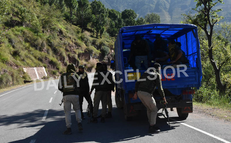 Security personnel in action at the encounter site in Bhatta Durrian area at Mendhar in Poonch district on Wednesday. —Excelsior/Rahi Kapoor