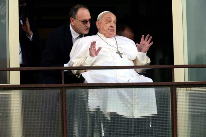 The 88-year-old pope gave a thumbs up and acknowledged the crowd after he was wheeled out onto the balcony overlooking the main entry of Rome’s Gemelli hospital, where hundreds of people had gathered on a brilliant Sunday morning.