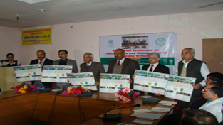 Poster on Conservation of Gharana Wetland being released during workshop in Jammu on Monday.