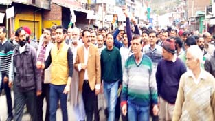 Led by former Minister and senior Congress leader Jugal Kishore Sharma, the protesting people marched through bazaars of Pouni town in the form of a procession, which culminated near the Tehsil office.