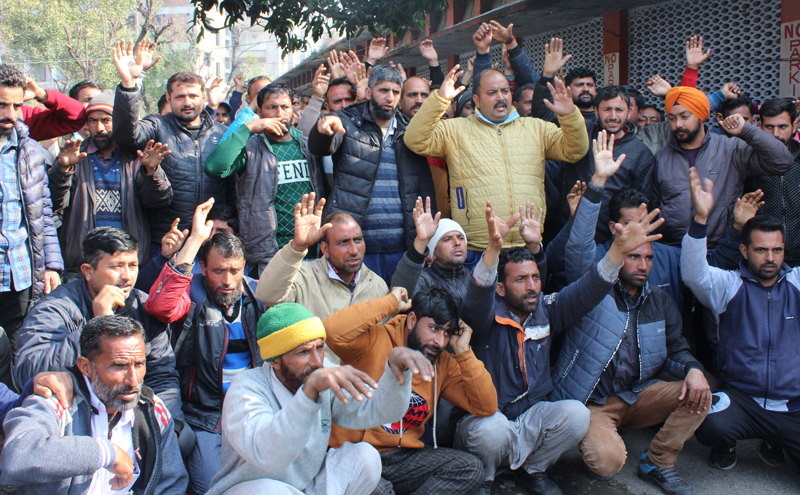 A large number of casual labours /workers under the leadership of Akhil Sharma, president – J&K Casual Labour, PDCL & PTCL Workers Union Jammu assembled near Press Club, near Main Tawi Bridge at Jammu in the morning and started protest demonstration. They were shouting slogans in support of their pending demands.