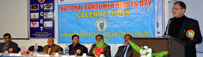 Speaker Legislative Assembly Kavinder Gupta speaking during an event organised to celebrate National Consumer Rights Day at Jammu on Saturday.