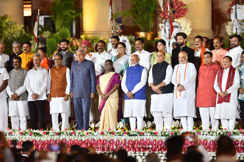 President Droupadi Murmu and Prime Minister Narendra Modi pose for a photograph with new Council of Ministers at the swearing in ceremony at Rashtrapati Bhavan in New Delhi on Sunday. (UNI)