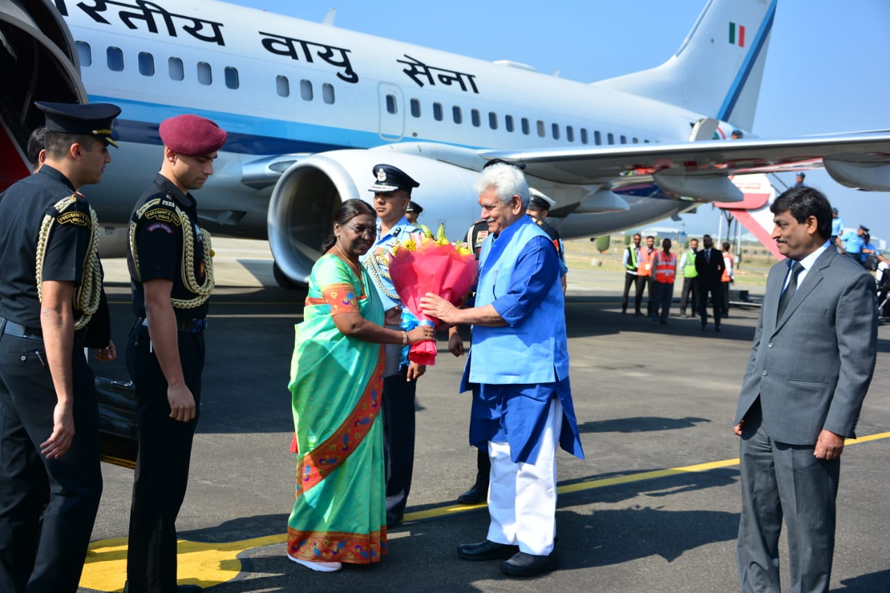 Lt. Governor of Jammu & Kashmir, Manoj Sinha received the President on her arrival at Srinagar airport.