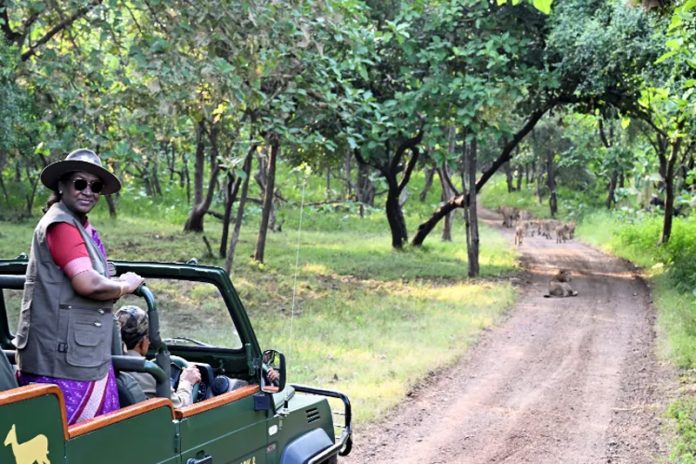 On the second day of her Gujarat visit, the President reached Sasan-Gir in the afternoon and enjoyed a lion safari inside the Gir National Park, the only surviving abode of Asiatic lions.