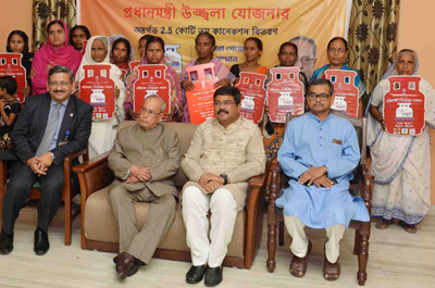 “Proud to join the Hon’ble @RashtrapatiBhvn Pranab Da in handing over #2.5CrUjjwala to Gauri Sarkaar at Jangipur House in West Bengal,” Pradhan later tweeted.