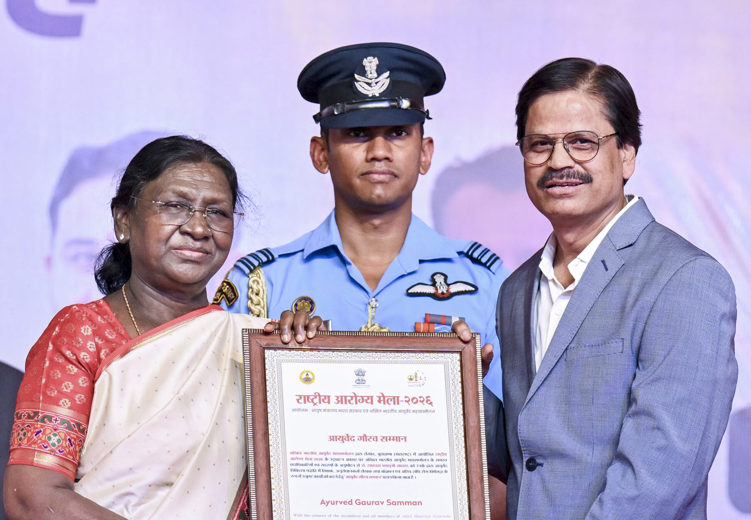 President Droupadi Murmu confers the 'Ayurved Gaurav Samman' to Dr. Ramdas Avhad during inauguration of National Arogya Fair 2026, in Shegaon, Maharashtra.