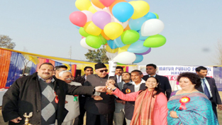 President National Conference Dr Farooq Abdullah releasing balloons while inaugurating Annual Day Function of Mayur Public School at Jhiri in Jammu on Monday.