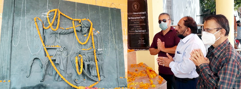 President of Dharmarth Trust and others paying homage to Maharaja Gulab Singh on Raj Tilak Divas at Jeo Pota in Akhnoor on Wednesday.