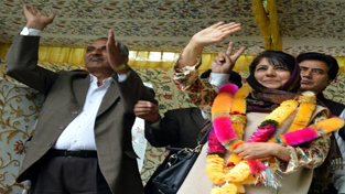 President of People’s Democratic Party (PDP) Mehbooba Mufti waiving to the supporters during a rally at Anantnag on Tuesday. -Excelsior/Sajad Dar