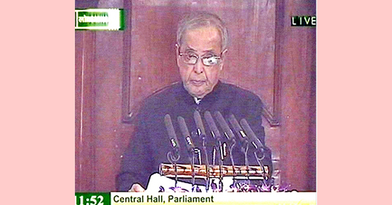 President Pranab Mukherjee addressing the joint session of Parliament at the Central Hall of Parliament House in New Delhi on Monday. (UNI)