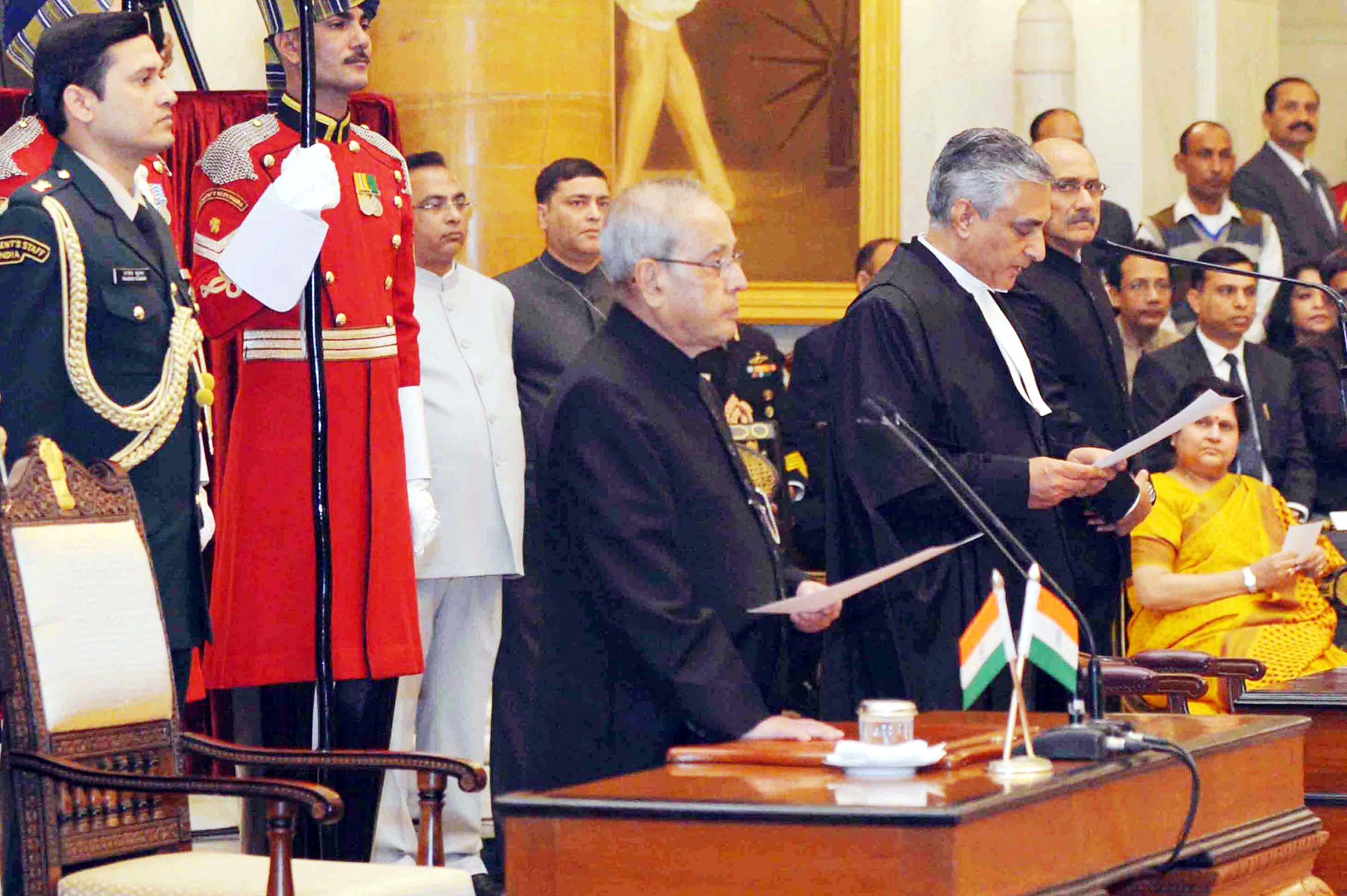 President Pranab Mukherjee administering the oath of office of Chief Justice of India to Justice T S Thakur at a swearing in ceremony at Rashtrapati Bhavan in New Delhi on Thursday. (UNI)