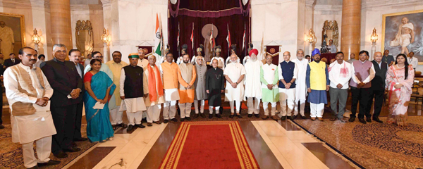 President Pranab Mukherjee, Vice President M Hamid Ansari and Prime Minister Narendra Modi pose for a photograph with newly sworn in Ministers at Rashtrapati Bhavan in New Delhi on Tuesday.(UNI)