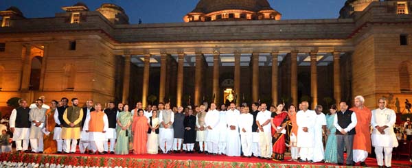 President Pranab Mukherjee,Vice President Hamid Ansari and Prime Minister Narendra Modi pose for a photograph with the members of the new Cabinet during the swearing in ceremony at Rashtrapati Bhavan in New Delhi on Monday.(UNI)