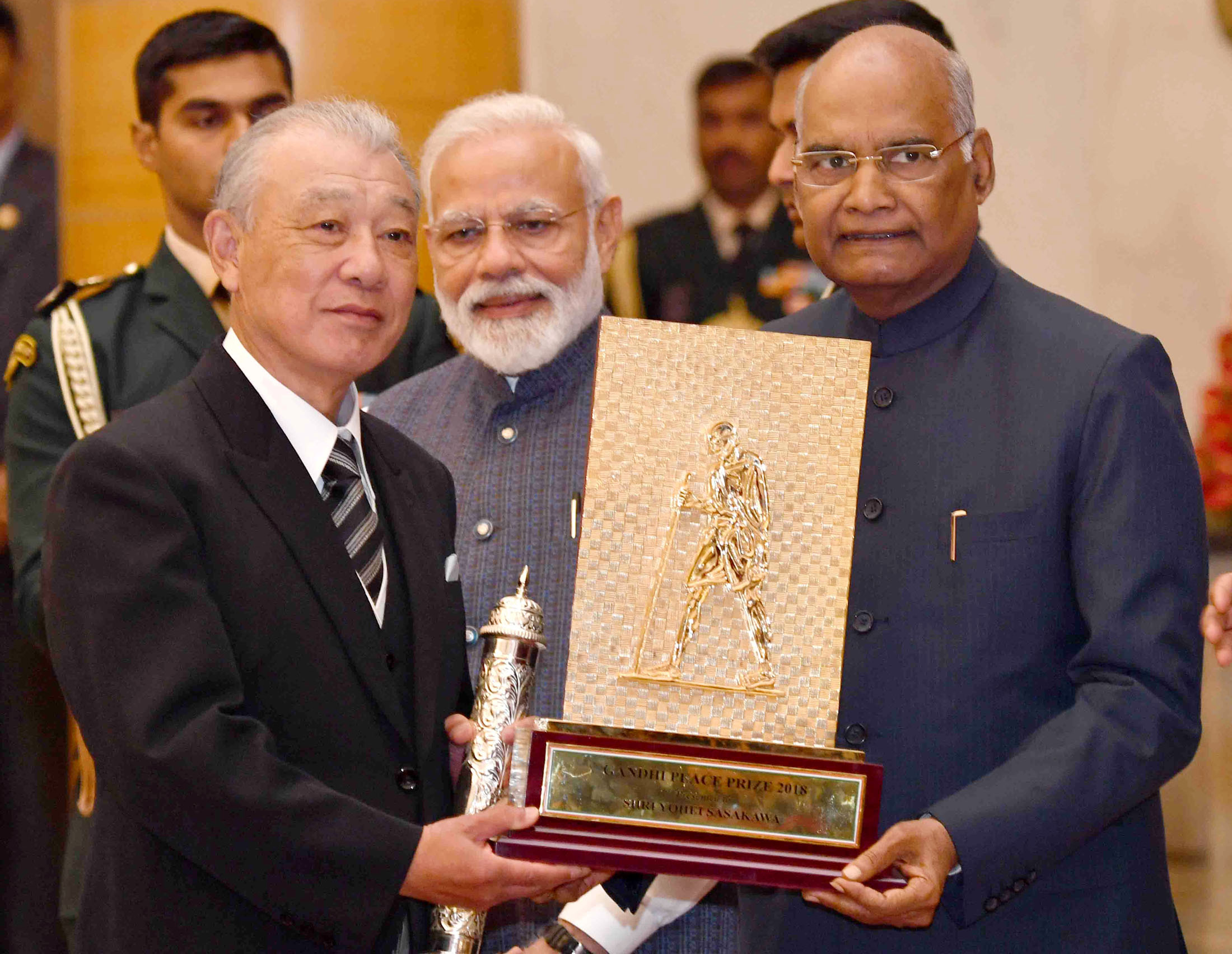 The Gandhi Peace Prize was presented to the Vivekananda Kendra, Kanyakumari for 2015, jointly to the Akshaya Patra Foundation and the Sulabh International for 2016, to the Ekal Abhiyan Trust for 2017, and to Yohei Sasakawa for 2018.