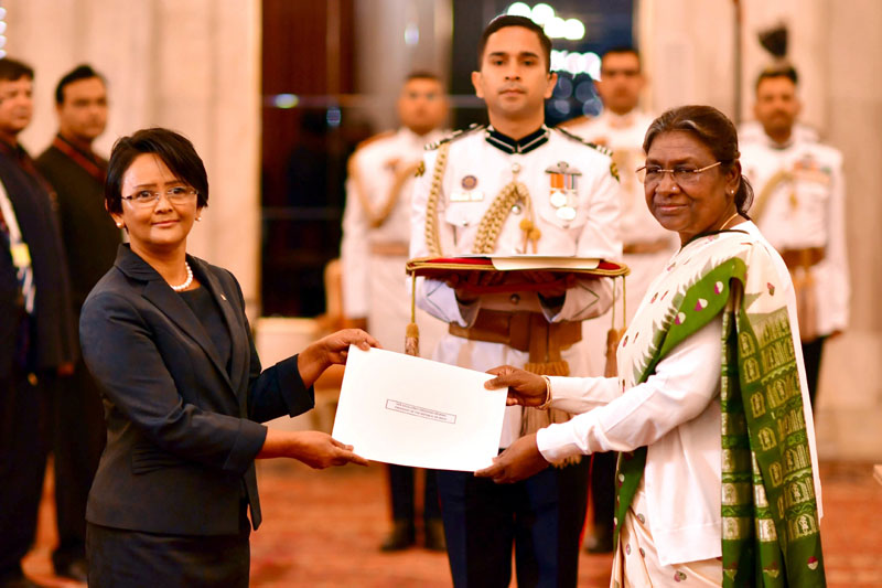 President Droupadi Murmu accepts credentials from Lalatiana Accouche, High Commissioner of the Republic of Seychelles, at Rashtrapati Bhawan, in New Delhi on Friday. (UNI)