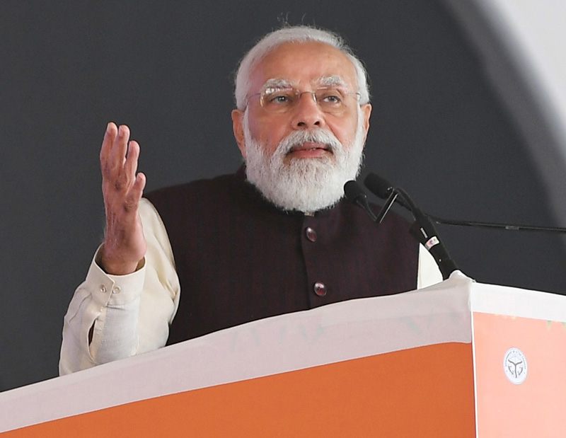 Prime Minister Narendra Modi addressing at the foundation stone laying ceremony of Noida International Airport at Jewar in Uttar Pradesh on Thursday.
