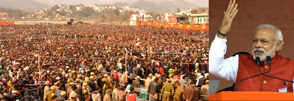 Prime Minister Narendra Modi addressing a mammoth public rally in Rajouri on Saturday. Another pic on page 6. —Excelsior / Bhat