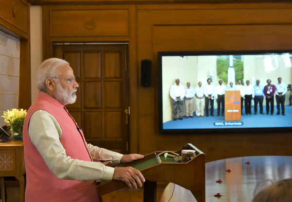 Prime Minister, Narendra Modi at the video conference with Heads of Governments from South Asian Nations, to mark the launch of the South Asia Satellite, in New Delhi on Friday.