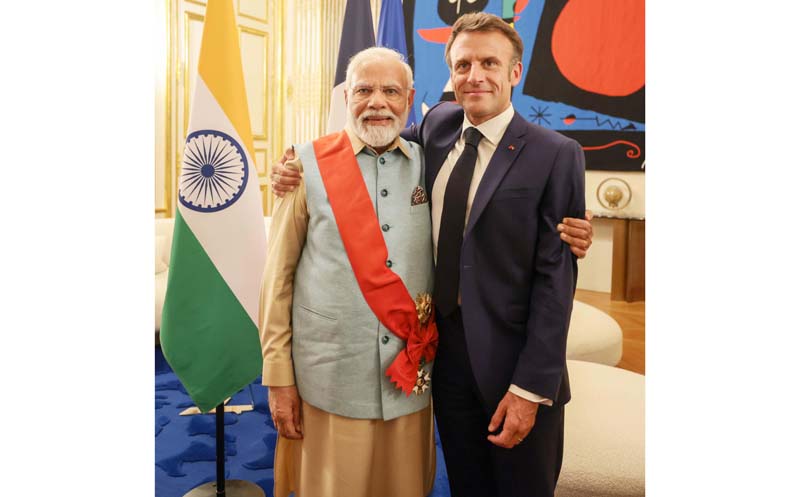 Prime Minister Narendra Modi being welcomed by President of the France Emmanuel Macron at Elysee Palace, in Paris on Friday. (UNI)