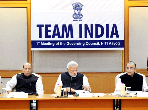 Prime Minister Narendra Modi chairing 'Team India', the first meeting of the Governing Council of NITI Aayog, in New Delhi on Sunday. (UNI)