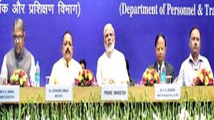 Prime Minister Narendra Modi presiding over the inaugural function of IAS Officers 2015 Batch, at New Delhi on Monday. Also seen are Union Minister Dr Jitendra Singh, Additional Principal Secretary to PM P.K. Mishra and Cabinet Secretary P.K. Sinha.