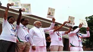 Prime Minister Narendra Modi releasing a publication of SAI on “Indian Olympics Journey”, at the flagging off ceremony of “Run For Rio”, at Major Dhyan Chand National Stadium, in New Delhi on Sunday. (UNI)