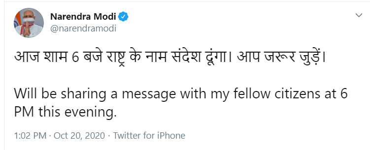 Prime Minister Narendra Modi will be sharing a message for citizens at 6 PM today By Daily Excelsior - October 20, 2020 Share FacebookTwitterWhatsAppPinterestLinkedinCopy URLTelegramEmailTumblrReddItPrintKoo Prime Minister Narendra Modi will be sharing a message for citizens at 6 PM today Follow our WhatsApp channel
