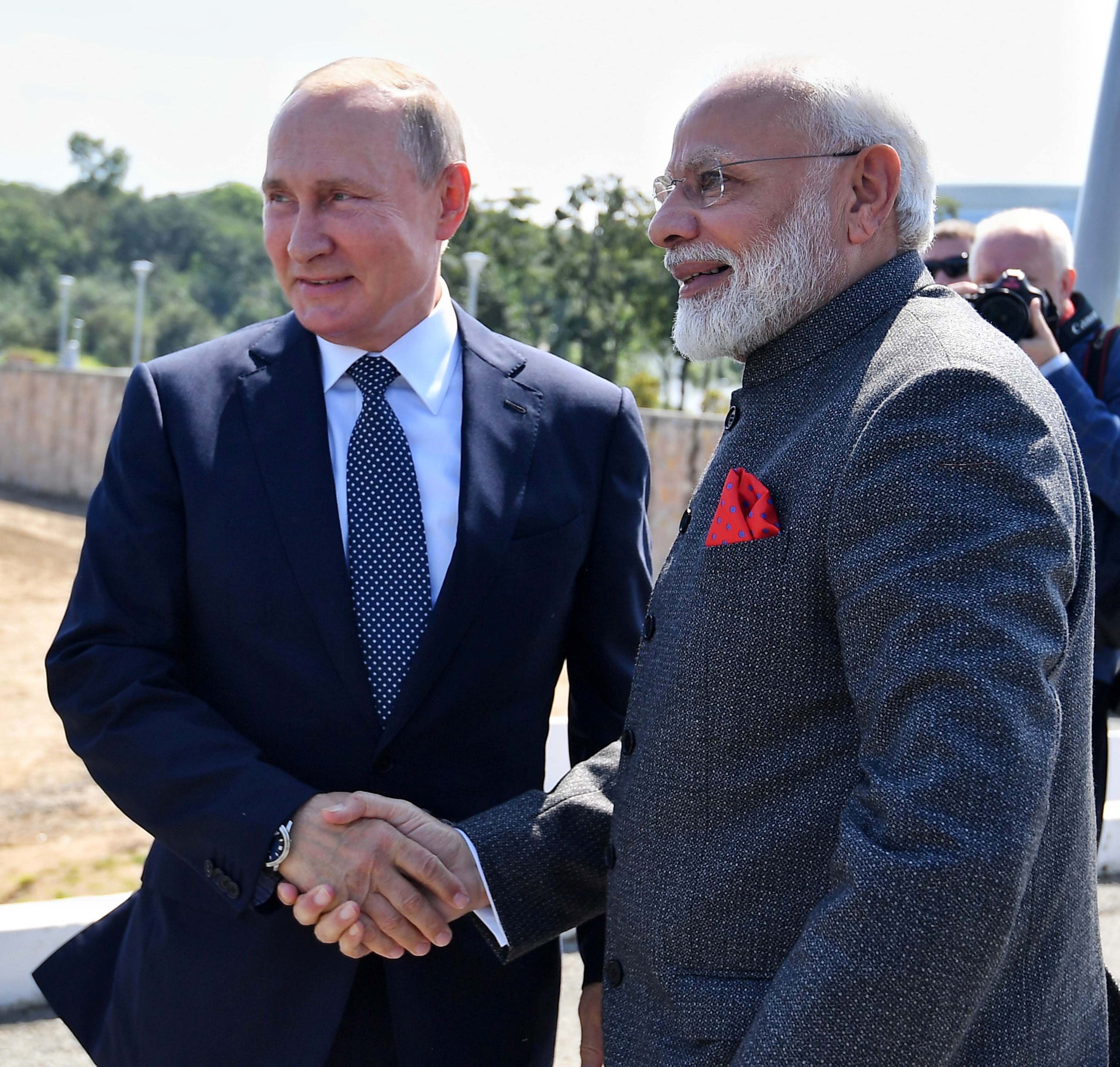 Prime Minister Narendra Modi with President of Russian Federation Vladimir Putin at Vladivostok, in Russia on Wednesday.(UNI)