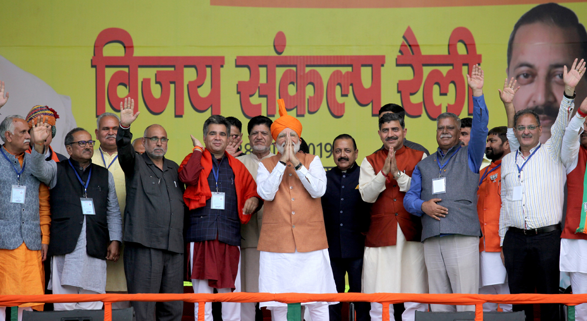 Prime Minister Narendra Modi with senior BJP leaders at Dhoomi, Akhnoor on Thursday.