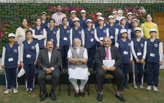 Prime Minister Narendra Modi with the youth and children from Jammu and Kashmir, in New Delhi on Tuesday. Minister of State for Development of North Eastern Region (I/C), Prime Minister’s Office, Personnel, Public Grievances & Pensions, Atomic Energy and Space, Dr Jitendra Singh and Union Home Secretary, Rajiv Mehrishi are also seen.
