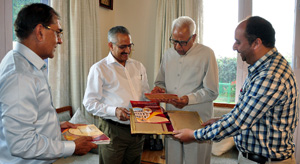 JAMMU, Apr 9: Dr. Rajesh Kumar, Principal DAV College, Amritsar, accompanied by Prof. Sunil Sachdeva, HoD English, and Prof. Arif Nazir, HoD Journalism, met Governor N.N. Vohra who had taught English in this College many years ago.