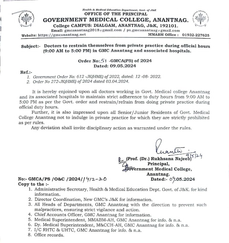 JAMMU, May 9: Principal Government Medical College Anantnag Dr Rukhsana Najeeb has warned all the doctors working in GMC Anantnag and its associated hospitals to restrain from indulging in private practice during the duty hours.