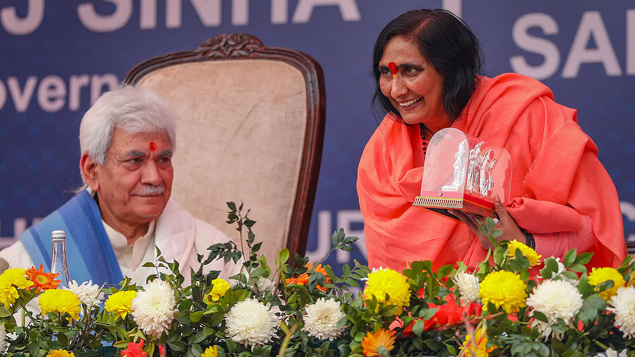 Jammu & Kashmir Lt Governor Manoj Sinha with Sadhvi Rithambara during the inauguration of a school on the outskirts of Jammu.