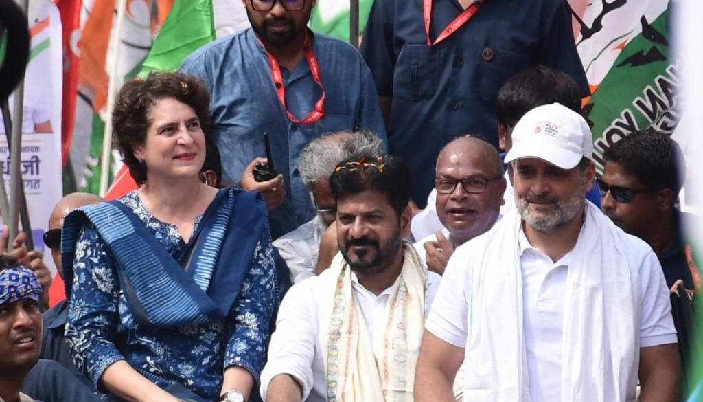 Vadra and Gandhi, along with Telangana Chief Minister Revanth Reddy, RJD leader Tejashwi Yadav and other representatives of the INDIA bloc, were seen sitting on the roof of an SUV, which was moving slowly, as they waved at an enthusiastic crowd.