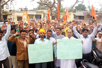 JAMMU, Mar 12: Dogra Front and Shiv Sena under the leadership of president, Ashok Gupta took out a procession from Chawtha, main suburbs of Samba to Highway Road against non-availability of CT Scan and other machinery in the District Hospital Samba (DHS).