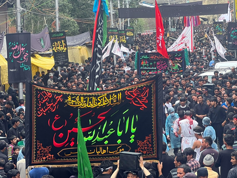 The Procession with Alams and clad in black cloths reciting lamentations on Shodae Karbala passing through Fatima Chowk, Isna Ashriya Chowk, Khomeni Chowk and Lal Chowk, concluded at Hussaini Park and Isna Ashriya Complex.