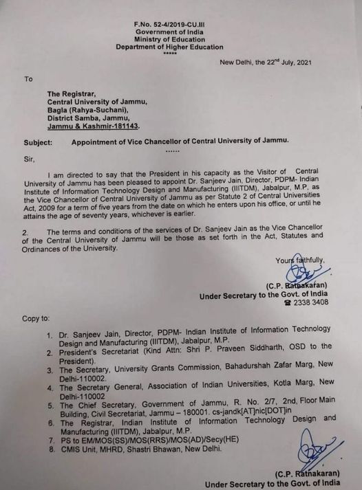 Prof Aima has been the VC of Central University of Jammu for more than six years. Madhya Pradesh resident, Prof Jain was appointed as the Vice Chancellor of Shri Mata Vaishno Devi University on March 15, 2016 for a term of three years, but he was given an extension of two years.