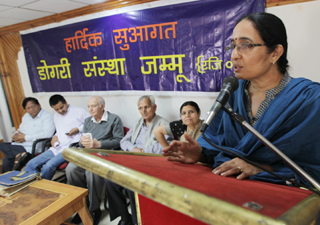 Prof Shashi Pathania raising a point during Dogri Sanstha one-day seminar on “Popularizing Dogri: Needs & Solutions” at KL Saigal Hall on Sunday. By Daily Excelsior - March 25, 2013 Share FacebookTwitterWhatsAppPinterestLinkedinCopy URLTelegramEmailTumblrReddItPrintKoo Prof Shashi Pathania raising a point during Dogri Sanstha one-day seminar on “Popularizing Dogri: Needs & Solutions” at KL Saigal Hall on Sunday. Follow our WhatsApp channel