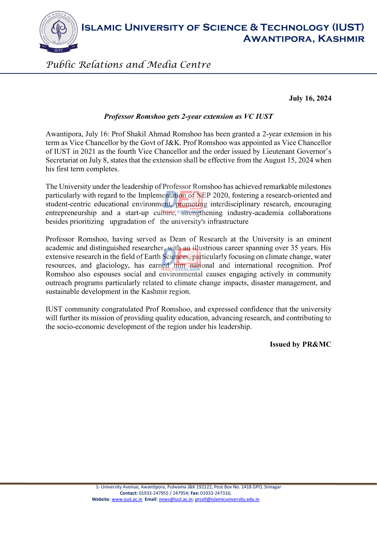 JAMMU, July 16: Prof Shakil Ahmad Romshoo has been granted a 2-year extension in his term as Vice Chancellor by the Govt of J&K. Prof Romshoo was appointed as Vice Chancellor of IUST in 2021 as the fourth Vice Chancellor and the order issued by Lieutenant Governor’s Secretariat on July 8, states that the extension shall be effective from August 15, 2024 when his first term completes.