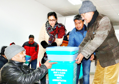 Later, CEC distributed blue and green coloured dustbins to the residents and shopkeepers of Choglamsar. He urged them to make proper use of these dustbins to segregate organic and inorganic waste. A short video on awareness on solid waste management was also shown.