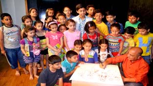 Prominent cartoonist, Chander Shekhar, teaching students the skill of making cartoons during a workshop at Natrang Studio Theatre, Jammu.