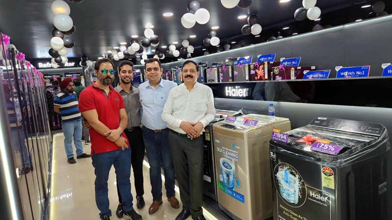 Proprietors of M/s Amit Electronics posing together in their showroom in Jammu.