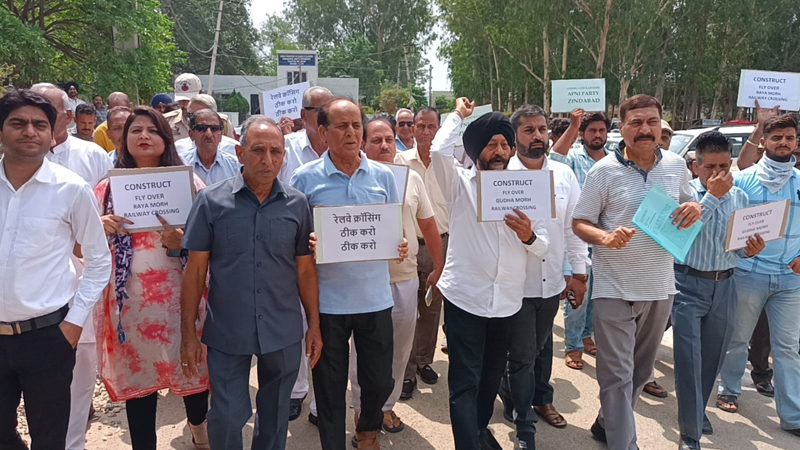 SAMBA, June 10: Apni Party leaders today accompanied by a large number of locals in Vijaypur staged a peaceful protest demonstration against Northern Railways claiming that hundreds of people in Gurah Morh and Raya Morh face difficulties daily because there is no flyover at railway track.