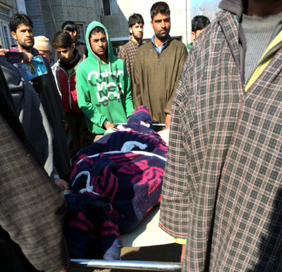 People carry body of a woman who died allegedly due to doctors' negligence in Sopore Hospital. -Excelsior/Aabid Nabi