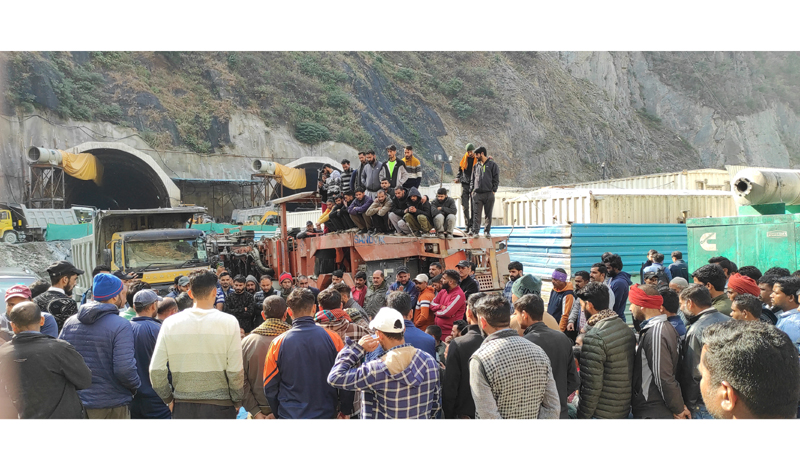 Tunnel construction workers during a protest at Digdool in Ramban on Thursday. —Excelsior/Parvez Mir
