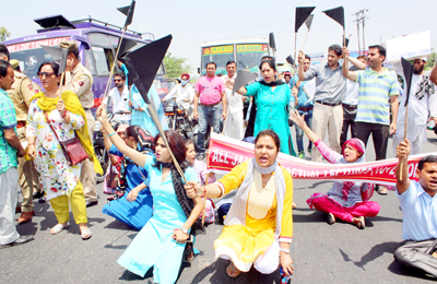 Amidst raising of slogans in support of their demands, the protesting Contractual Lecturers, mostly females,  marched from Press Club Jammu towards Div Com office. However, they were stopped by Police near  Bikram Chowk following which the protesters staged a dharna on the ever busy Tawi Bridge for some time.