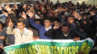 Protesting teachers taking out protest march in Jammu on Wednesday.    —Excelsior/Rakesh