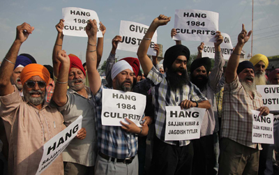 Led by Sudershan Singh Wazir, president of Sikh United Front, the protesters raised slogans against the UPA Government and for  justice to victims of the 1984.